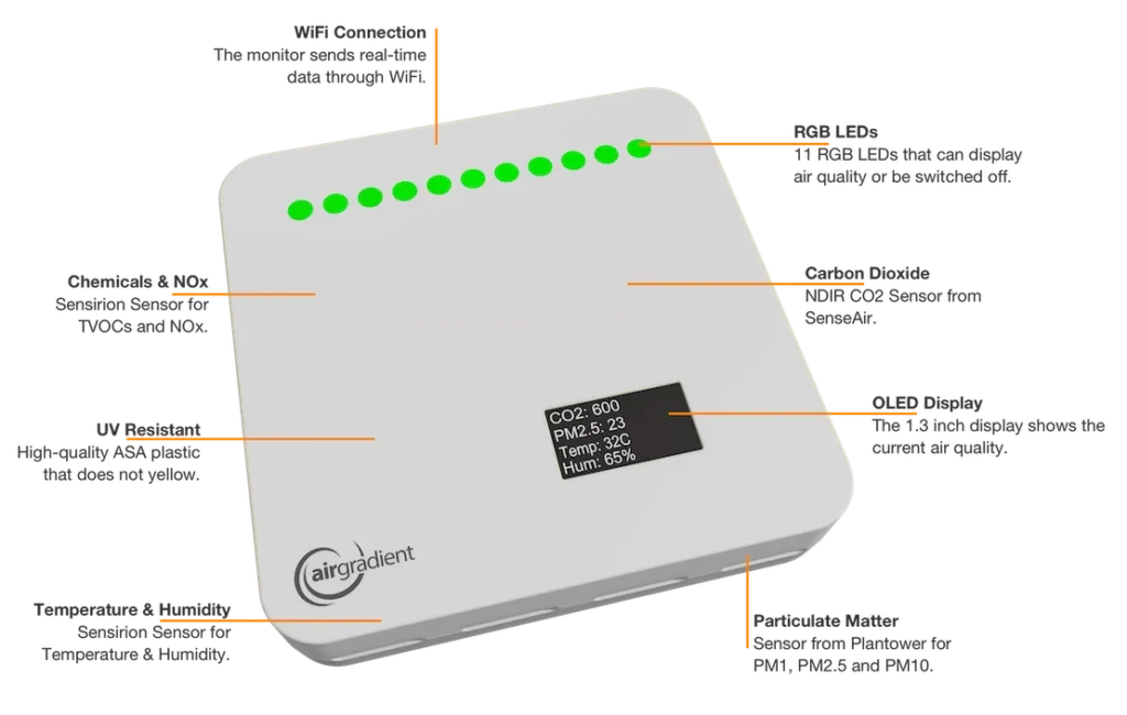 The AirGradient ONE is an indoor air quality monitor that helps you understand whether the air you breathe is healthy. It tracks PM2.5, CO₂, TVOCs, NOx, temperature, and humidity, and features a built-in color LED bar along with a compact display for quick visual feedback.